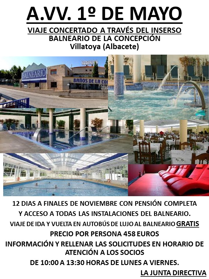 Viajes Viaje Balneario de la Concepción Villatoya (Albacete) Publicado por Asociación de Vecinos 1º de Mayo el octubre 8, 2019octubre 13, 2019 Comparte esto: Compartir en X (Se abre en una ventana nueva) X Comparte en Facebook (Se abre en una ventana nueva) Facebook Me gusta Cargando... Relacionado