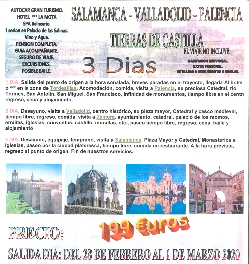 Viajes Viaje Tierras de Castilla (Salamanca) 3 dias del 28 de Febrero al 1 de Marzo del 2020. Publicado por Asociación de Vecinos 1º de Mayo el diciembre 22, 2019 Comparte esto: Compartir en X (Se abre en una ventana nueva) X Comparte en Facebook (Se abre en una ventana nueva) Facebook Me gusta Cargando... Relacionado