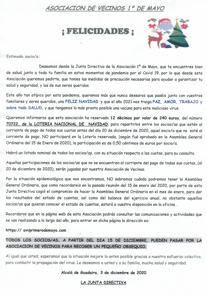 Noticias Felicitación Navidad 2020 Publicado por avvprimerodemayo el diciembre 14, 2020 Comparte esto: Compartir en X (Se abre en una ventana nueva) X Comparte en Facebook (Se abre en una ventana nueva) Facebook Me gusta Cargando... Relacionado