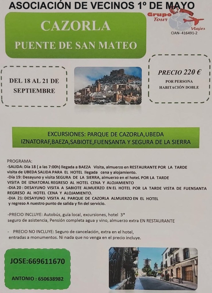 Viajes Viaje a Cazorla (Día de San Mateo del 18 al 21 de Septiembre del 2021) Publicado por avvprimerodemayo el septiembre 1, 2021 Comparte esto: Compartir en X (Se abre en una ventana nueva) X Comparte en Facebook (Se abre en una ventana nueva) Facebook Me gusta Cargando... Relacionado